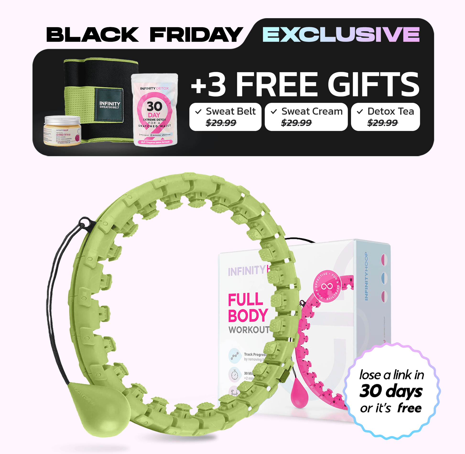If you use the Infinity Hoop for 30 days (30 minutes daily) without removing a link withing a month, we’ll give you a full refund. (Terms here)